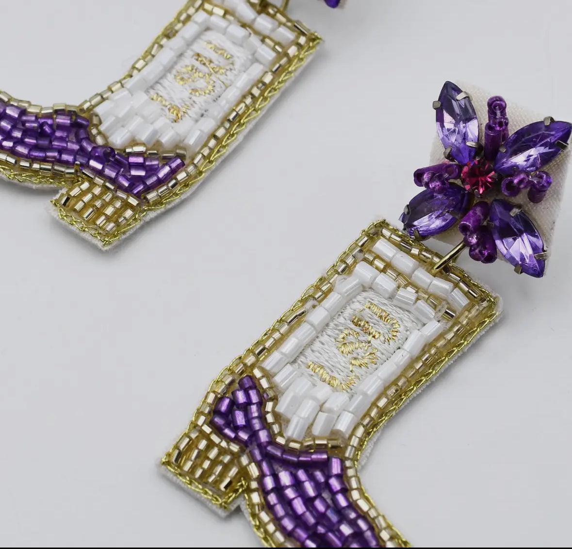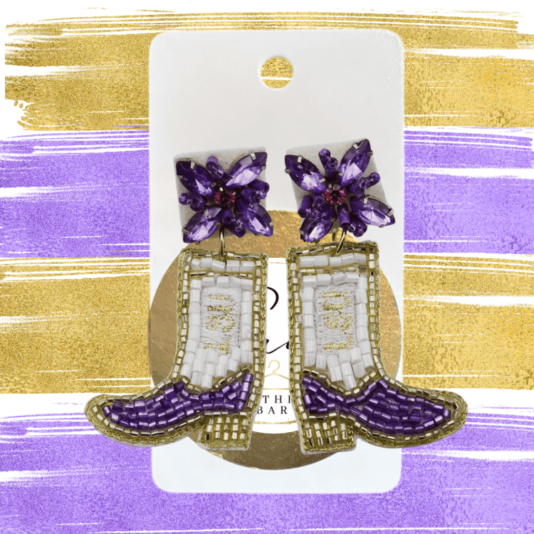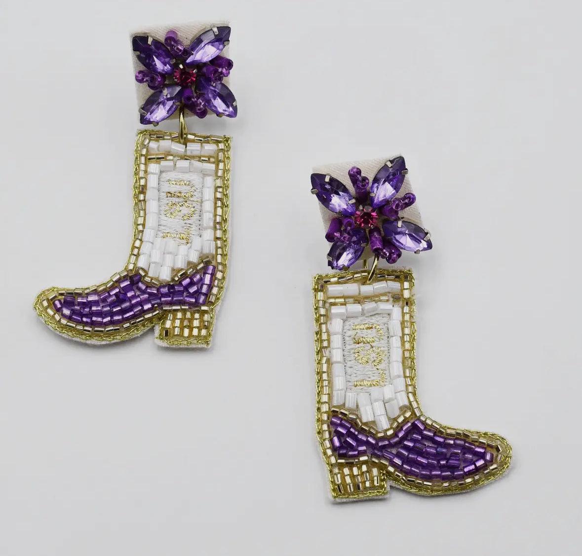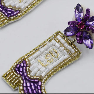 LSU Tiger purple and gold beaded game day boot earrings. Perfect for LSU game days!